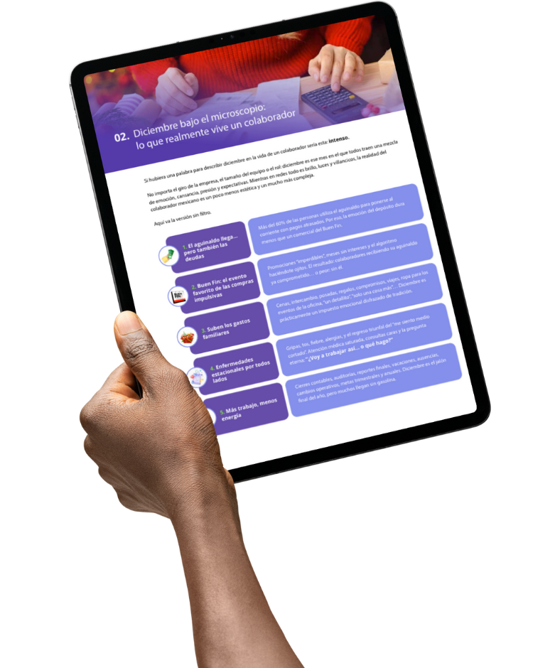 Diciembre concentra tres presiones: financieras, operativas y emocionales. El aguinaldo llega al mismo tiempo que las deudas, el Buen Fin, los gastos familiares, cierres de año y un pico en las enfermedades respiratorias. El resultado: colaboradores agotados, preocupados por su dinero y con poca energía para el cierre del año.